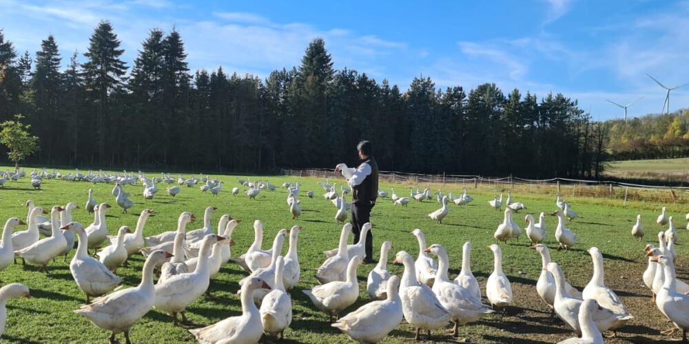🌾 Gans ohne Stress – aus artgerechter Haltung Unsere Gänse stammen ausschließlich aus heimischer Landwirtschaft. Sie wachsen auf satten Weiden auf, sind von klein auf menschenbezogen und erhalten hochwertiges Futter. Das Ergebnis: beste Qualität und feiner Geschmack, den man schmeckt und fühlt.